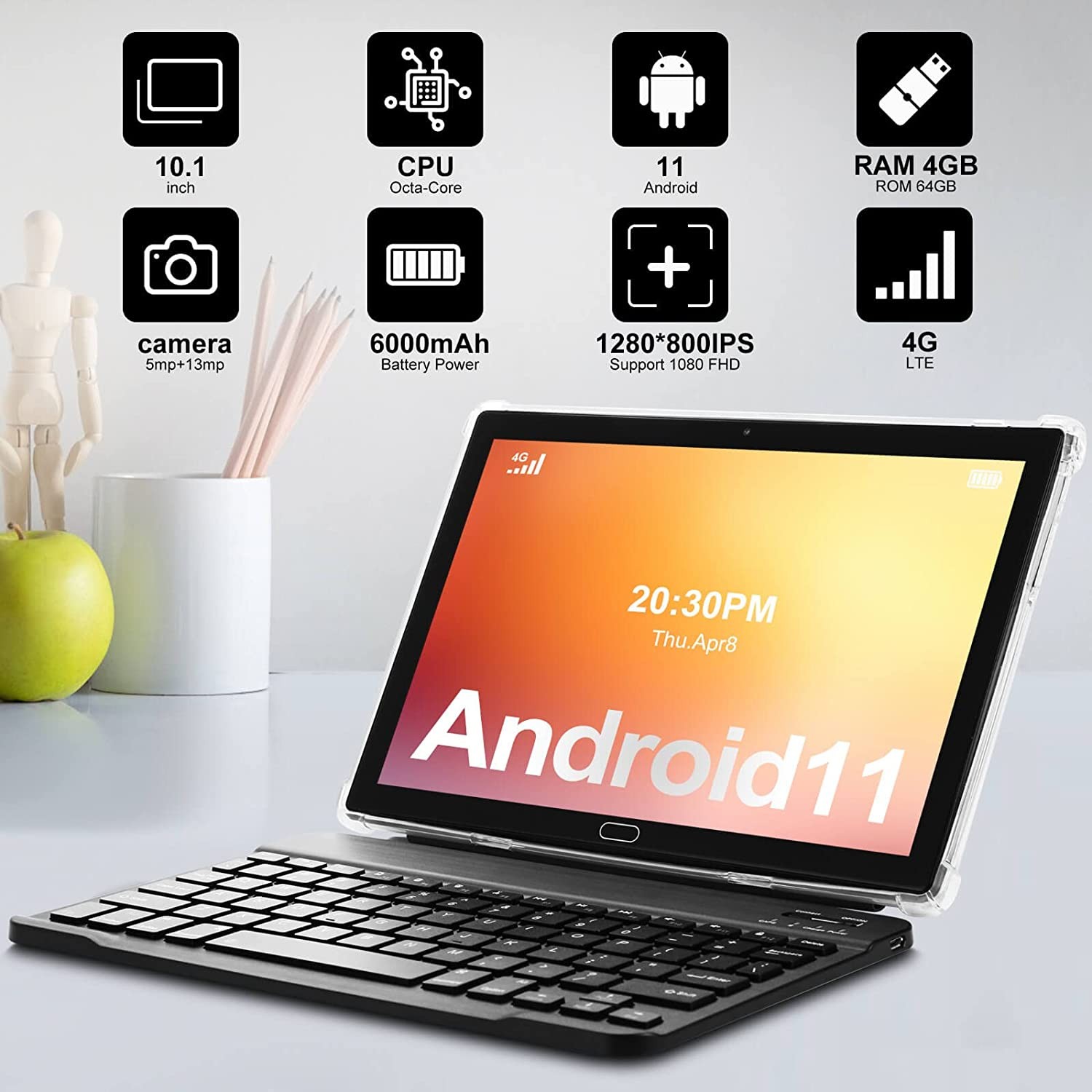 Tablet 10 inch Android 11 4G LTE Tablet PC 2 Sim Slot, 4GB RAM 64GB ROM 128GB Expandable, Google Certified Octa-Core Tablet with Keyboard Pen Case 13+5MP Camera,Phone Call,Bluetooth WiFi GPS Video
